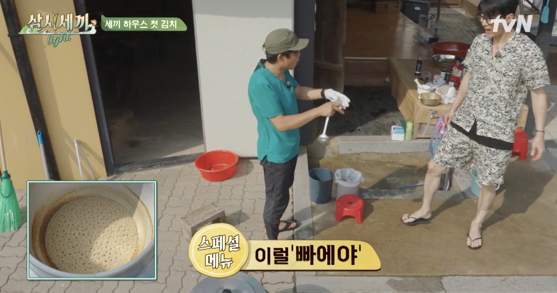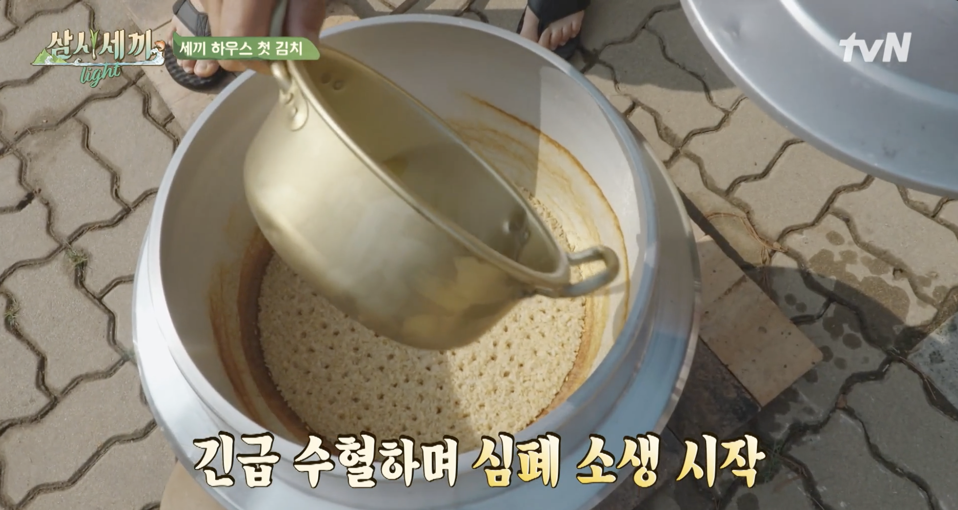 이제부터는 건강을 생각해야 할 나이라서 그런지 모르겠지만, 흰 백미가 아니라 오분도미라도 준비해달라던 유해진의 요청대로 제작진이 오분도미를 준비해 두었는데요. 준비 된 오분도미로 자신있게 밥을 하던 유해진. 하지만 결과가 처참합니다. 심폐소생 하려고 물을 부어보는데 차승원이 열어보곤 "이걸로 빠에야 만들어먹어야겠다." 라는 반응을 하죠. 그 말에 또 "이럴 빠에야" 라는 요리를 만들자는 유해진. 그의 농담에는 한계가 없습니다. ㅋㅋ